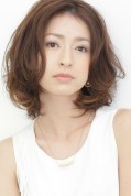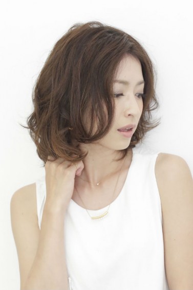 大人美髪ミディアムレイヤースタイル!長めの前髪に柔らかいカールをつけてボリュームのあるスタイル。ベースのカットは鎖骨ラインのミディアムの長さ。あまり短すぎないのでスタイルチェンジするにも挑戦しやすい!量もすいているので日々のケアも簡単!