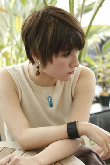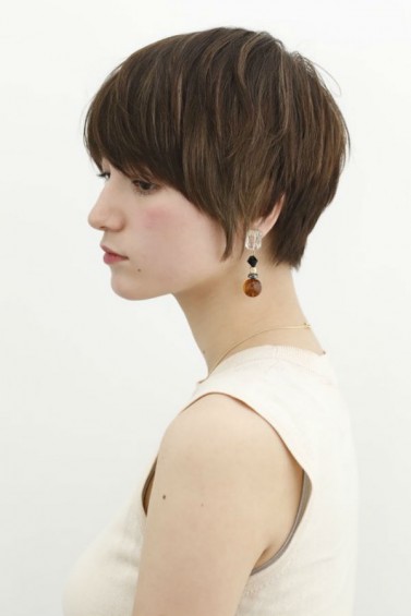 襟足などかなりスッキリした印象のショートですが、もみあげの長さがあり耳掛けもでき大人な綺麗さを残したベーリーショート。バックの高さがやや短く頭の形と首の美しさを強調してくれます。ジグザグバングとハイライトもポイントです。